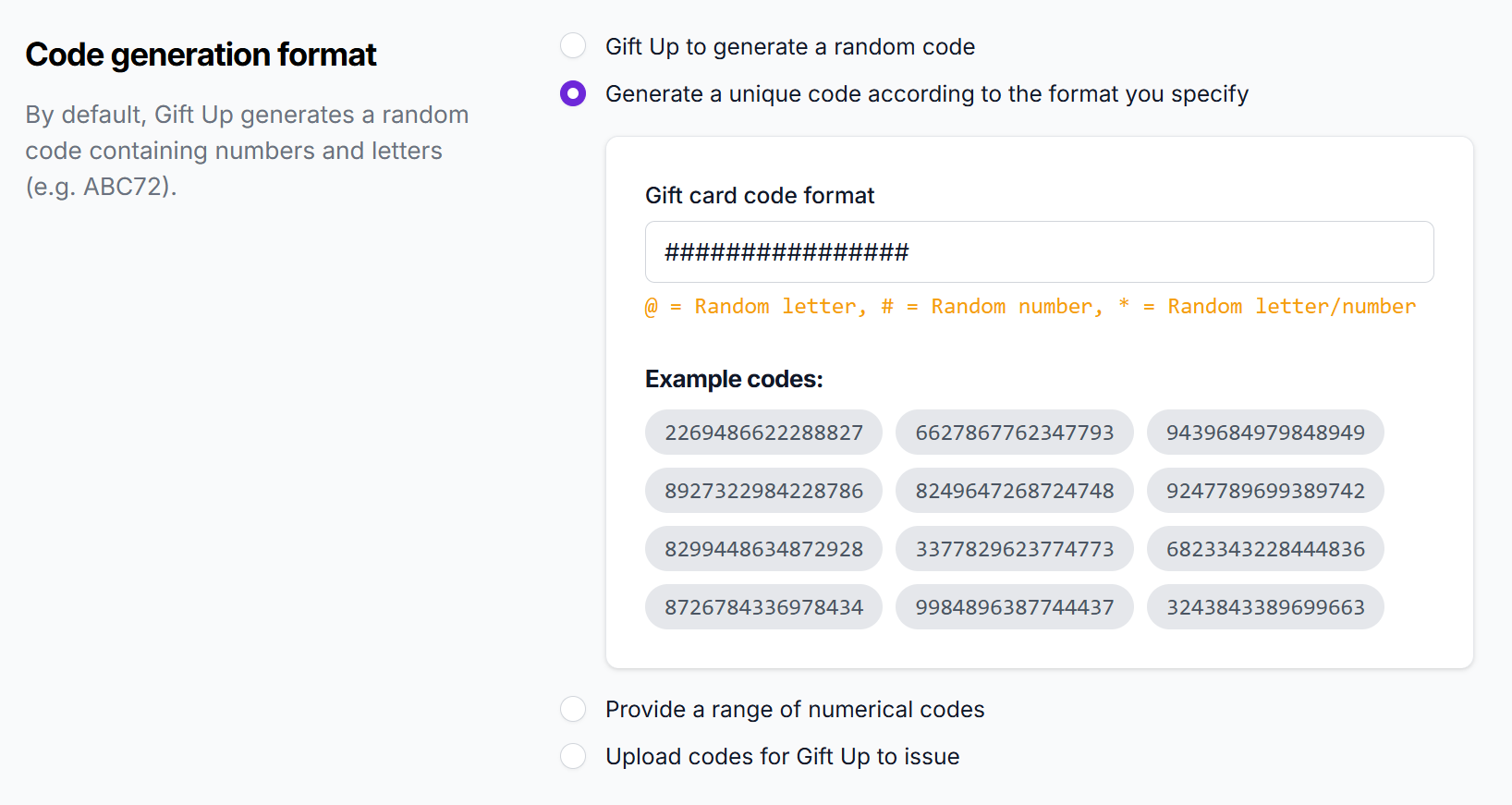 - Head to https://giftup.app/settings/gift-cards#code-generation-format