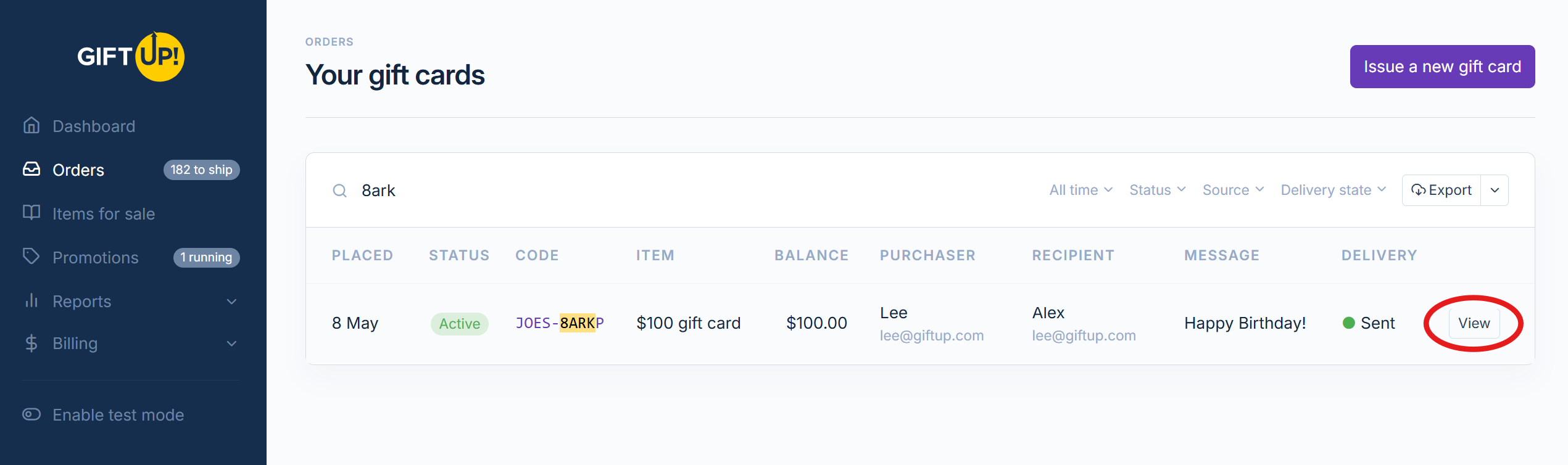 - Locate the gift card by code (or by name, email etc...), and view the gift card