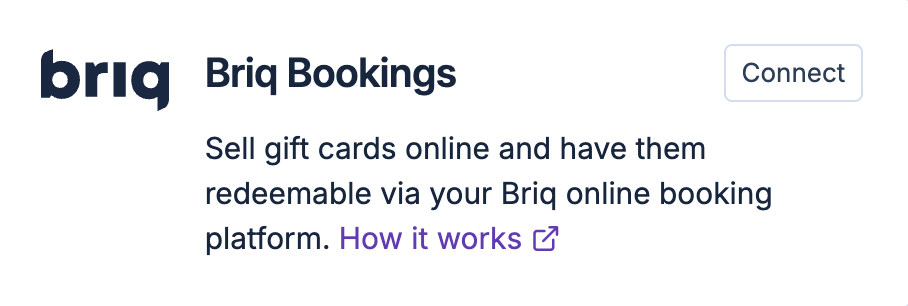 The connection process is all initiated from the Briq bookings side, and once complete, your clients will be able to use a Gift Up issued gift card against your Briq bookings account.