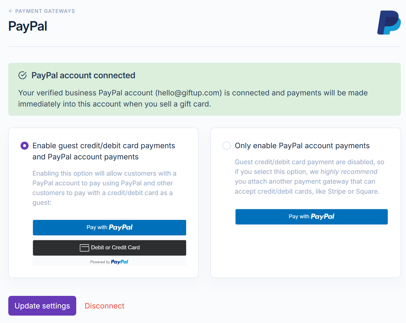 If you have a PayPal account (either a personal or a business account), you can connect this to Gift Up, and we will take payments using your PayPal account. You get the full gift card revenue deposited into your PayPal account immediately. We then collect our 3.49% fee in a monthly invoice we issue to you.